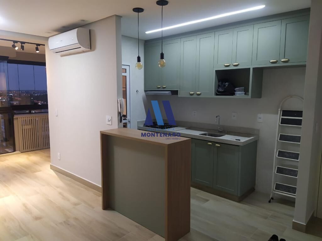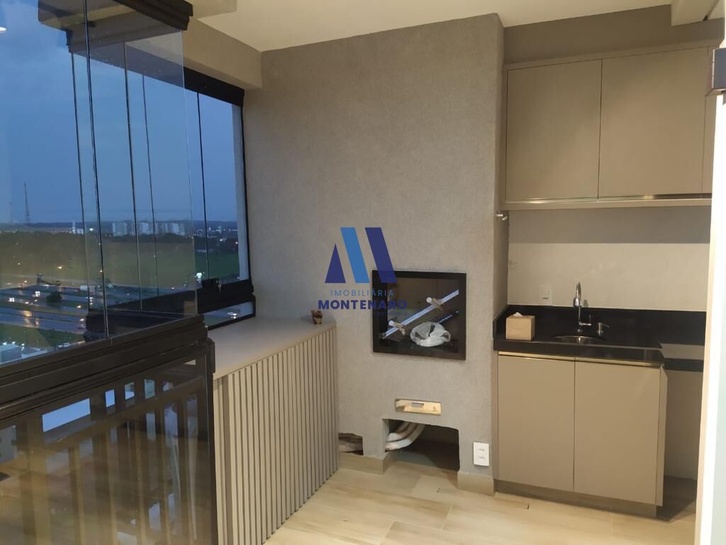 - Sala para dois ambientes com ar-condicionado integrada à sacada gourmet com churrasqueira