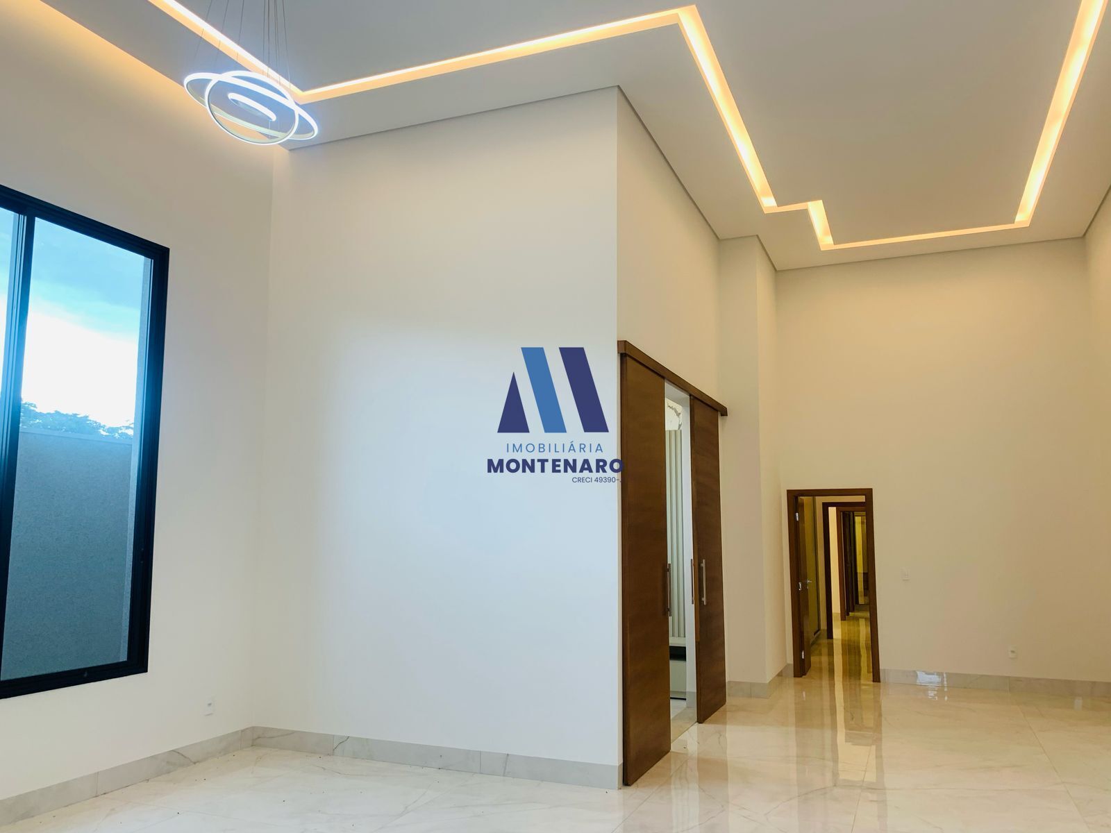 Sala com pé direito alto de 5m, lustre, sanca de gesso